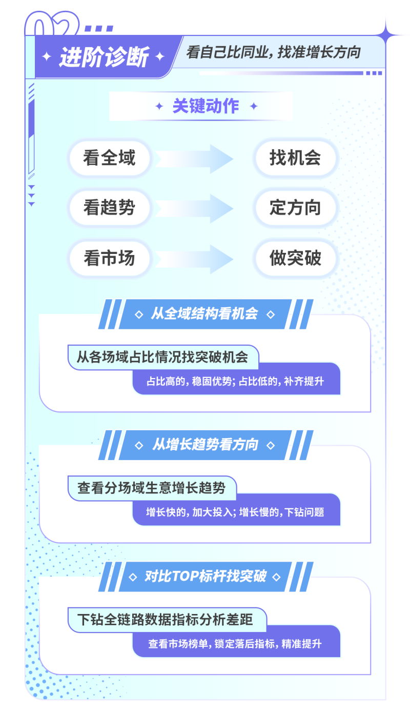 从FACT+S各场域生意占比看机会,从生意增长趋势看方向,对标行业品牌和关键指标找突破,依托「增长加速器」进阶诊断,品牌可快速找准增长方向,优化经营。