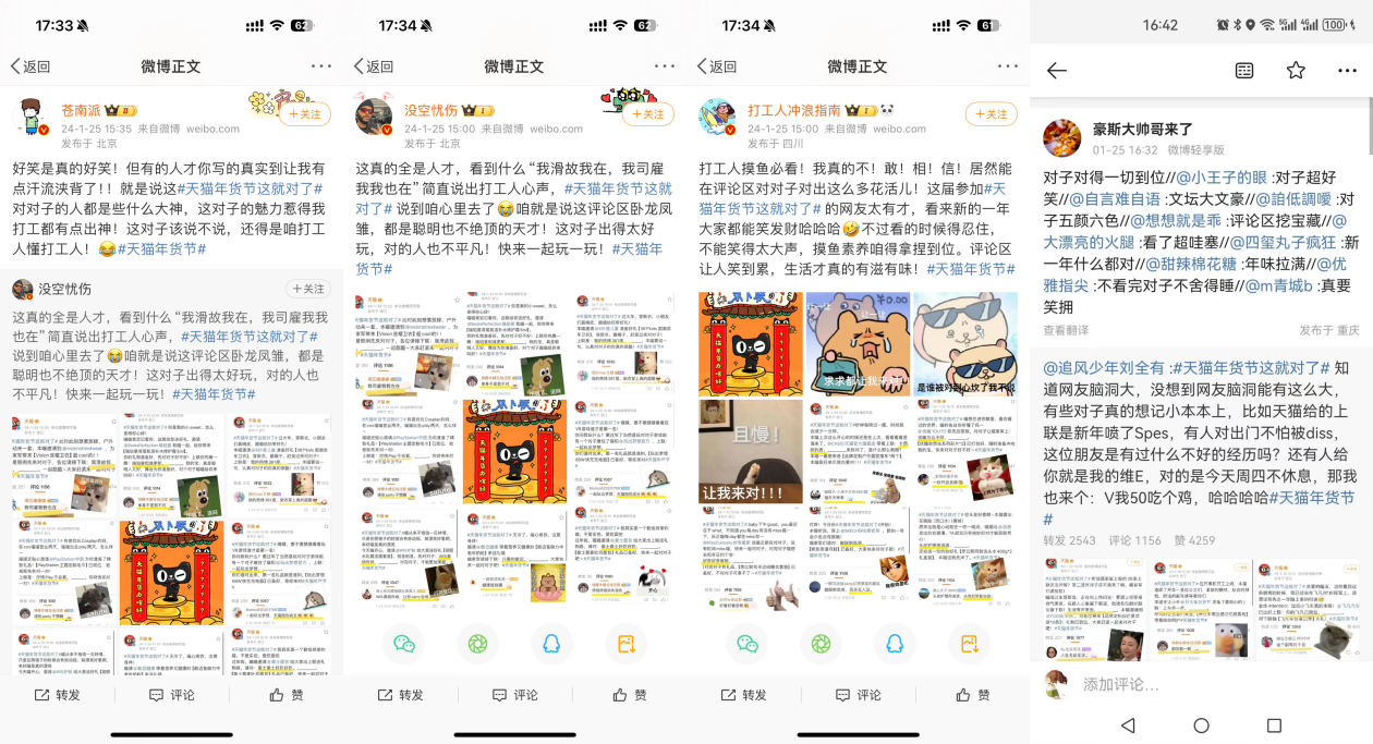 除此之外,天猫官方发布60余家品牌联合微博,传递年货节参与品牌与货品信息,互动拉近品牌与用户的距离。打工人文学、霸总文学、绿茶文学、发疯文学霸屏,也正是因为这些受欢迎的文体天猫迎合了用户心理,真正在内容上达成用户互动强化。