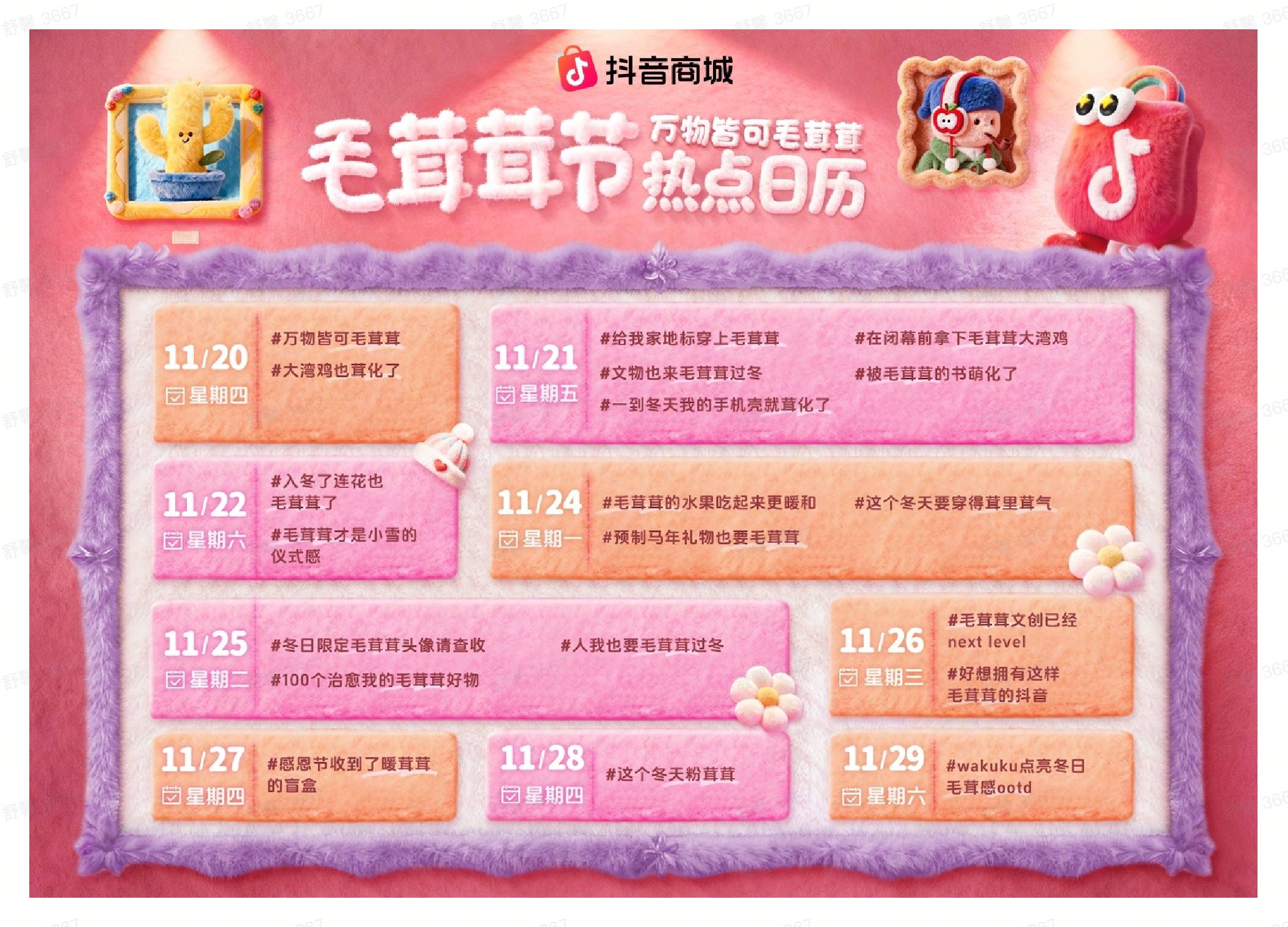 紧贴这股温暖消费潮流,11月20日起,抖音商城推出「毛茸茸节」品类活动,旨在契合年轻人“上头”热点,帮助玩偶、毛茸家居服、新奇文创周边、毛茸外套、毛茸鞋子等“毛茸茸”相关商品,借助抖音商城内容营销带来生意转化的闭环价值,以热点成趋势、以趋势带消费,加速好物曝光与转化,帮助商家抢滩“可爱经济”与冬季“治愈经济”新风口。