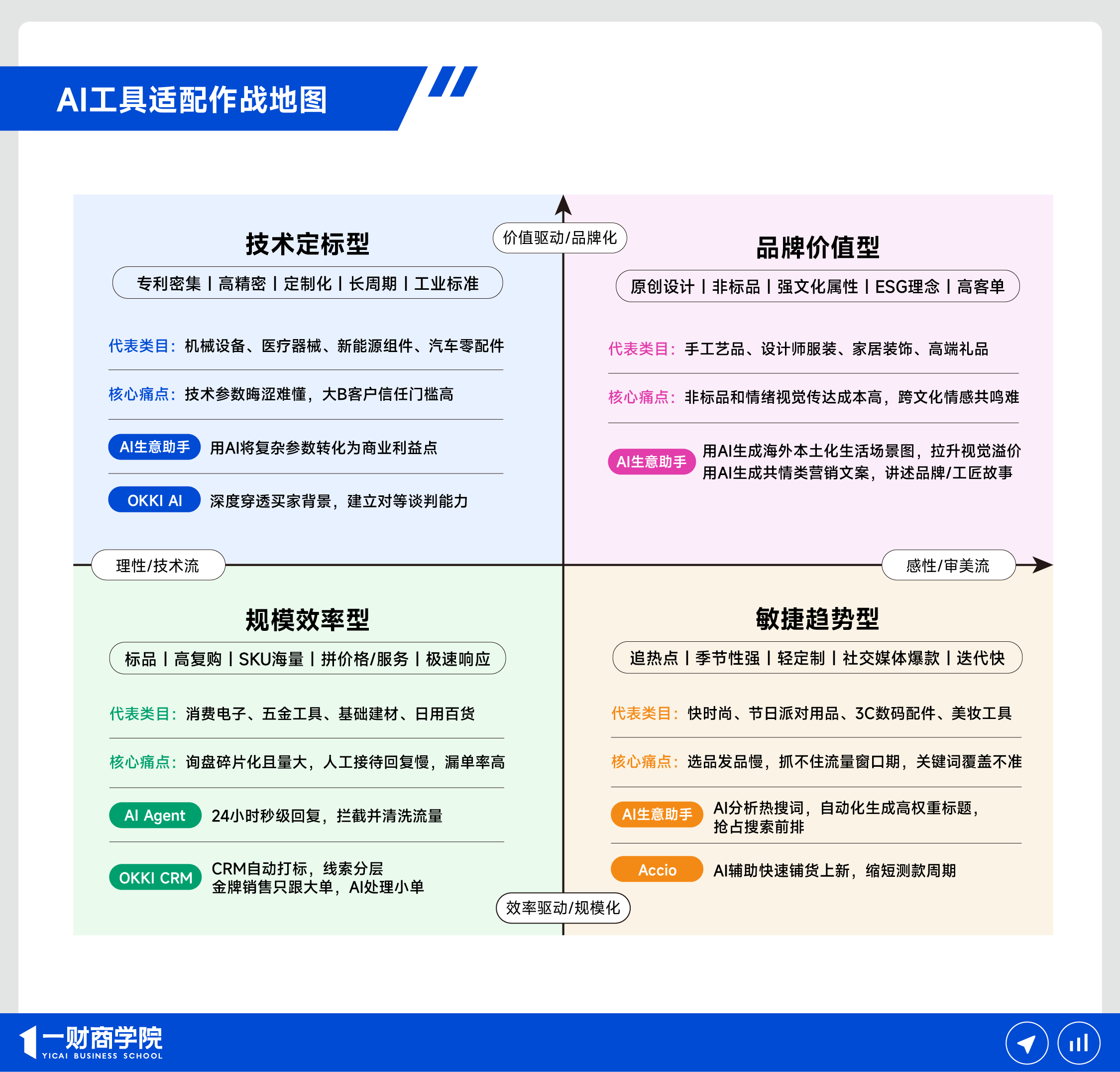 基于这些隐形冠军的实践,我们梳理出了以下AI工具适配作战地图,让商家能迅速对号入座,知道在国际站的经营中,该拿起哪一件武器。