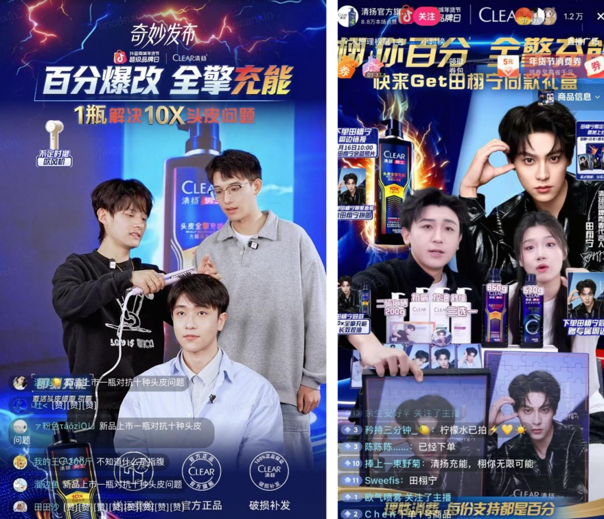 商家联动青春代言人田栩宁推出「栩你百分」定制礼盒,并通过“1+1+2”的货组策略精准覆盖男女群体。营销层面,合作抖音超级品牌日,结合明星素材实现全链路引流,并在直播间铺排“素人改造”内容大场。这种“从头开始”的场景经营,驱动官宣当日直播GMV同比膨胀24倍,位居洗护行业第一。