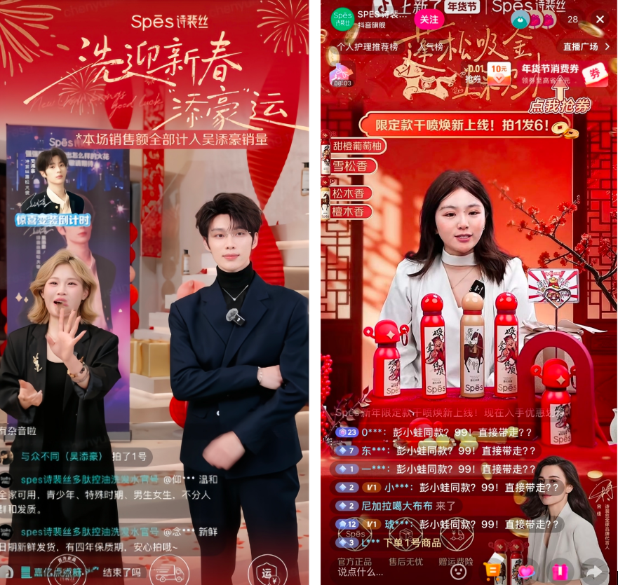 在营销端,商家联动热播短剧《金屋藏娇》男主吴添豪,打造定制番外及“添豪运”主题直播大场,强化「洗迎新春 添豪运」的应节寓意。通过场景心智的深度经营,驱动其直播间GMV膨胀2.2倍,全线直播间GMV增长1.9倍,实现了从功能满足到情感沟通的策略升级。
