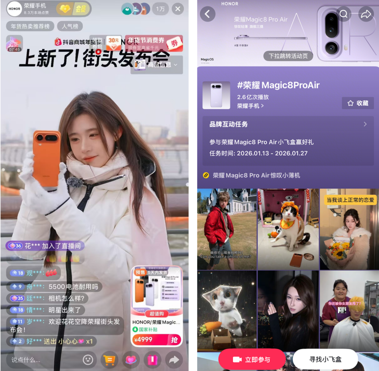 在场景策略上,荣耀 Magic8 Pro Air 携手美妆跨界联动,精准锁定高审美、高消费力的时尚科技跨界人群,借助《时尚芭莎》高端美妆圈层的调性赋能新机美学认知,夯实“科技即美学”的高端定位,深化高净值人群对新机外观设计与高端质感的感知。并在抖音中,构建“创作者+明星+全民”的立体传播矩阵,强化在用户心智中的“时尚美学跨界趋势引领者”认知,实现影响力的全域渗透。最终收获了总体曝光超2.6亿,搜索次数环比提升30%的亮眼成绩,实现了人群破圈与声量爆发。